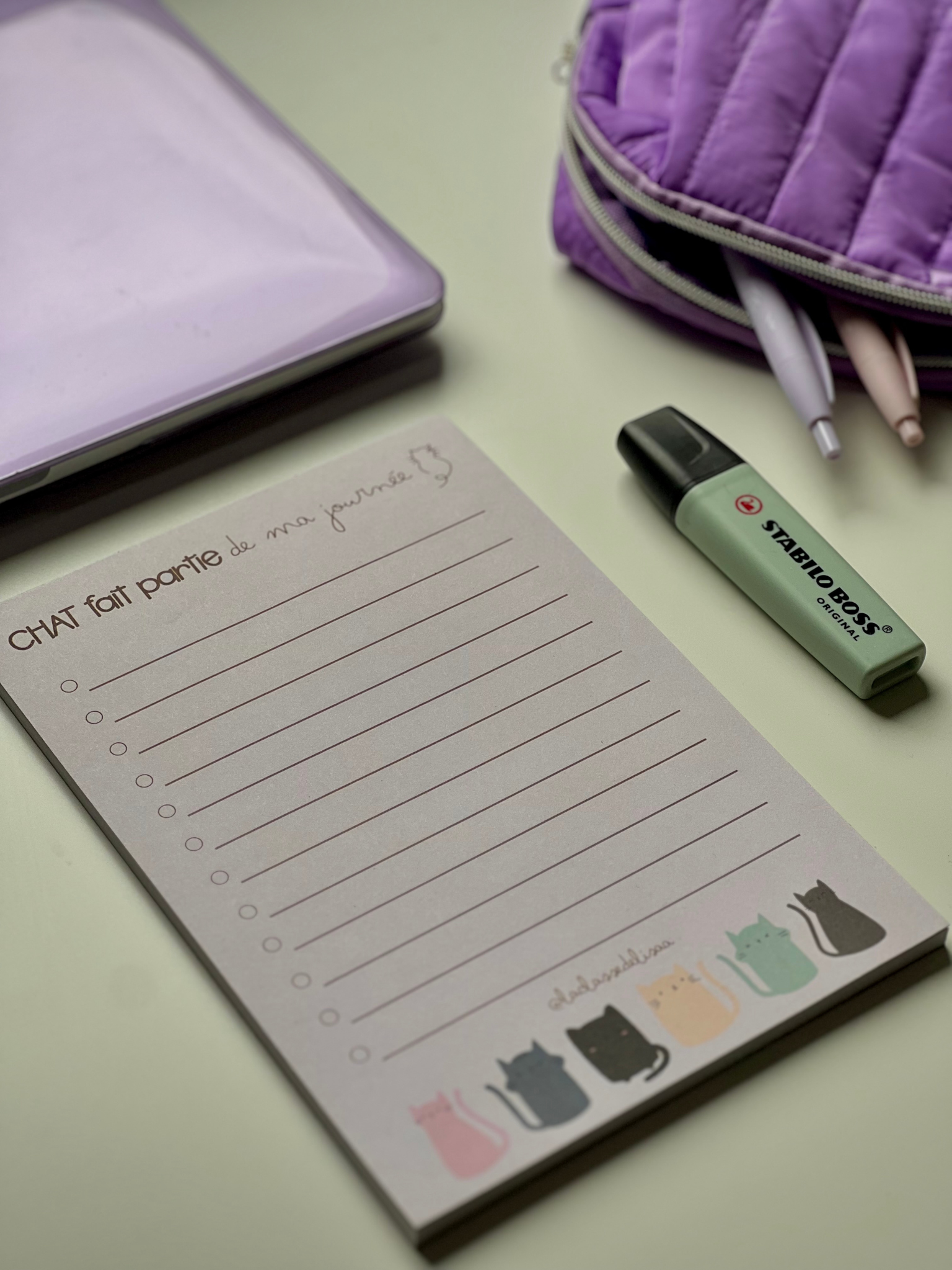 Chaque page est illustrée de petits chats colorés qui accompagnent ta to-do list.