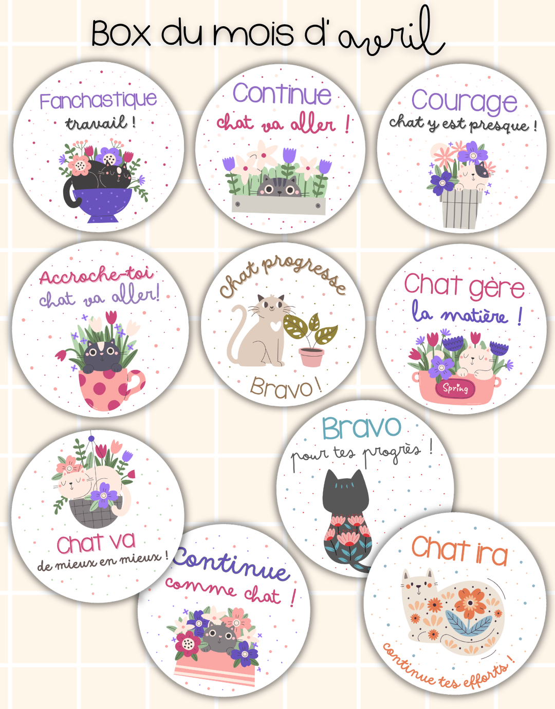 Chaque box contient 10 planches de stickers à thème, conçues pour favoriser le renforcement positif dans votre classe. Ces stickers sont exclusifs, vous ne pourrez les obtenir qu’en vous abonnant à la box ! En plus, chaque mois, une petite surprise vous attend... 🤭