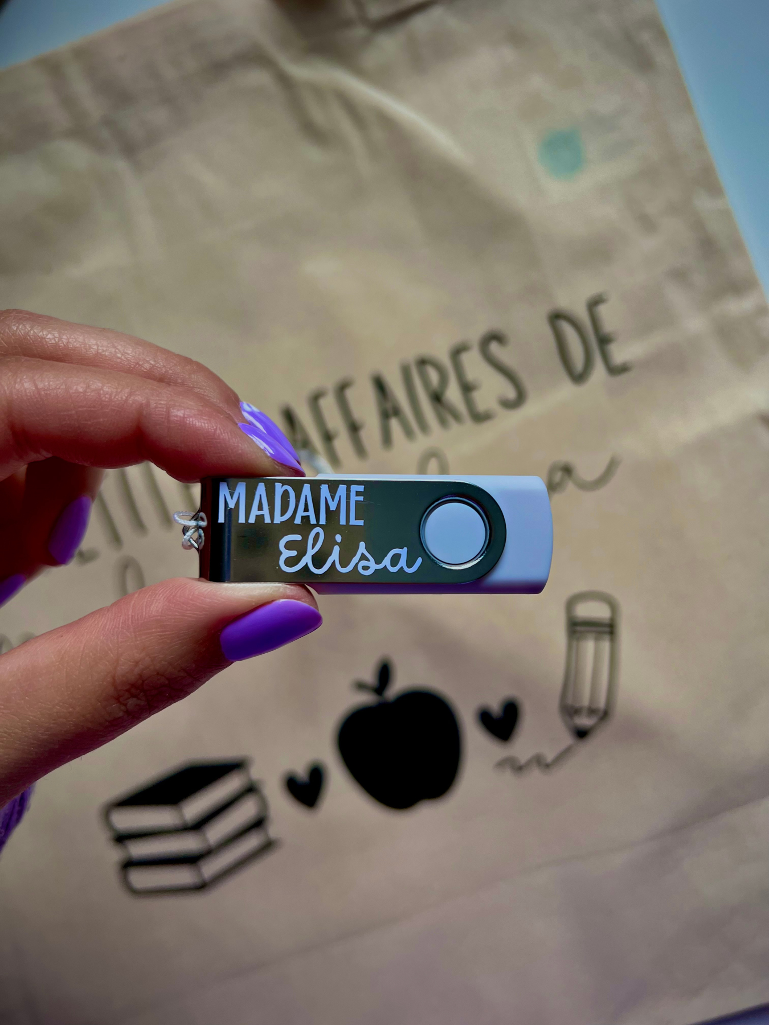 Parce que nos cerveaux de profs sont déjà bien remplis, cette clé USB personnalisée est là pour garder en sécurité tous tes précieux fichiers : préparations, documents de classe, évaluations, projets… et même les petites pépites dénichées sur Insta ! 😉